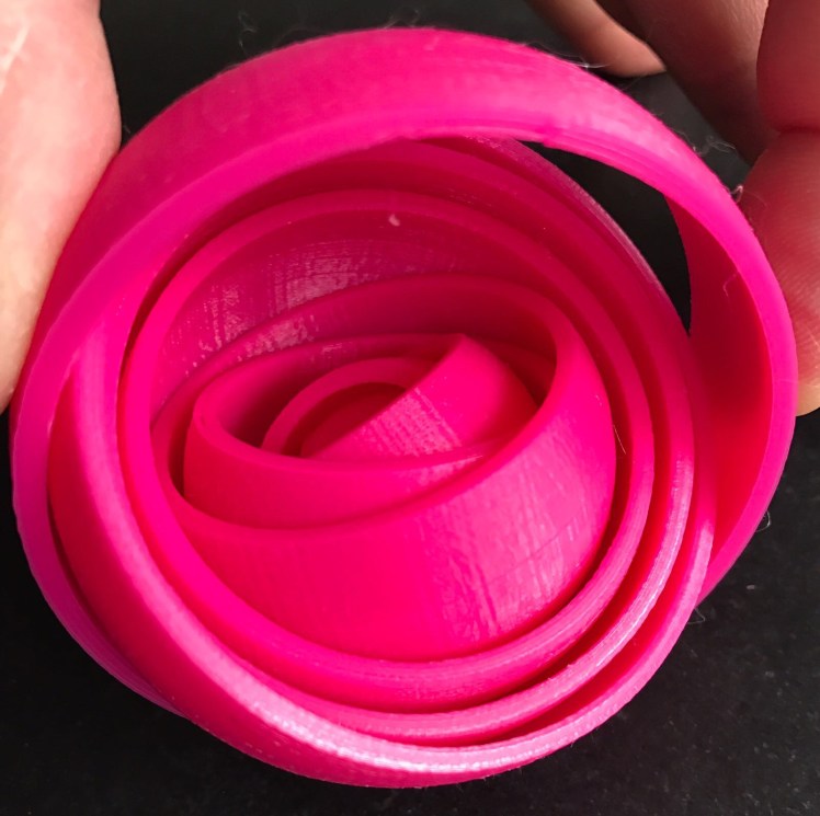 We are currently printing a spheroid- a ball with differently layers that rolls around inside itself. It will take all night.